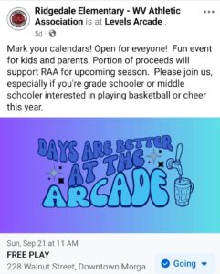 Sept 21st (11am-4pm)Levels Arcade By ridgedaleathleticassociation | August 28, 2025 | Comments Off on Sept 21st (11am-4pm)Levels Arcade $10 at the door and play all you can 11-4 pm! Sept 21st. All are welcome bring your family and friends! Portion of proceeds will benefit RAA. Posted in Events and tagged Event, fundraiser